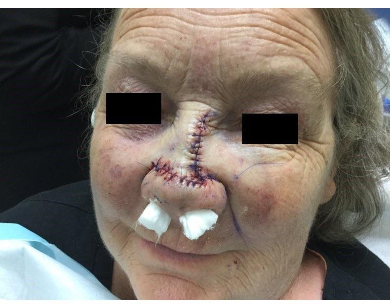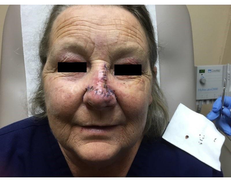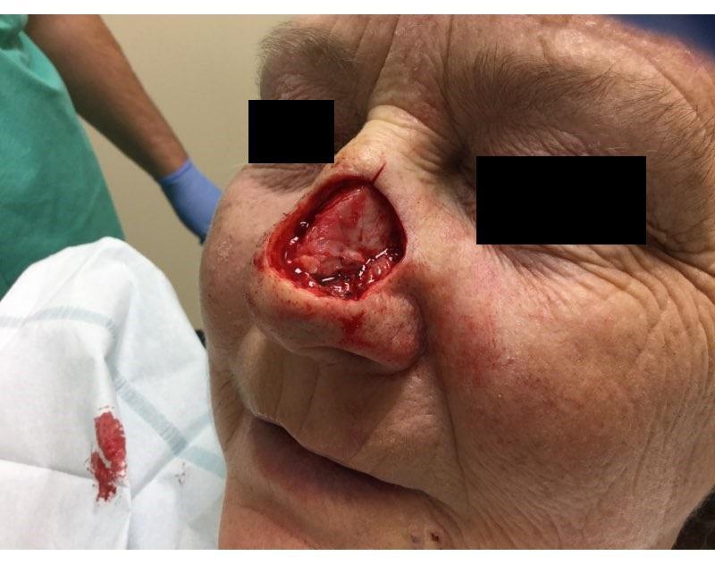 The surgery and microscopic evaluation of the tissue revealed a very large and aggressive tumor that had invaded deeply into the nose. The tumor was much larger than it looked and involved a significant portion of the nose (Figure 2).