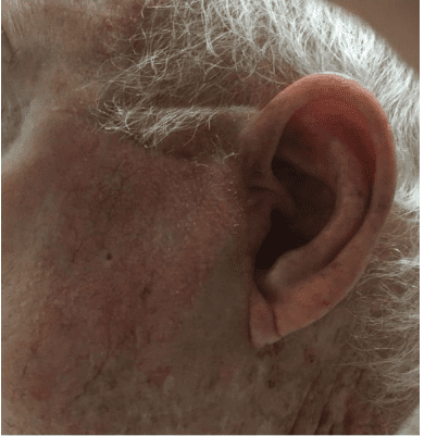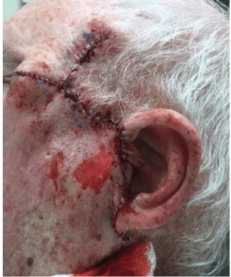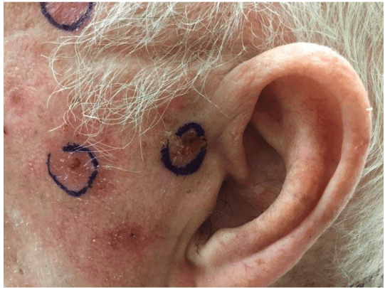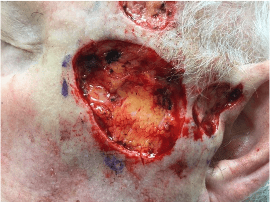 A 81-year-old male presented to our office for the treatment of several recurrent nodular and infiltrative basal cell carcinomas of his left temple, left cheek and left preauricular area