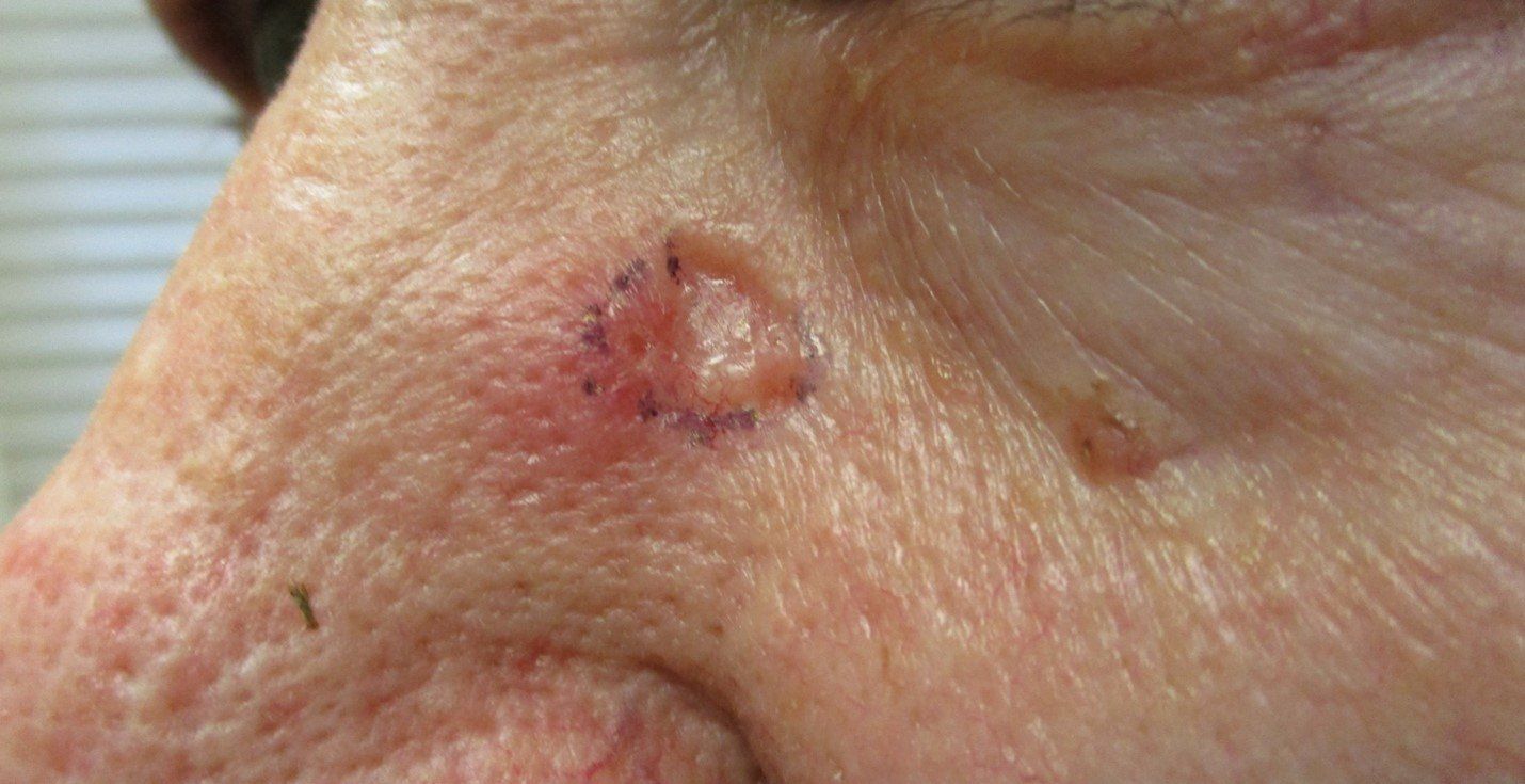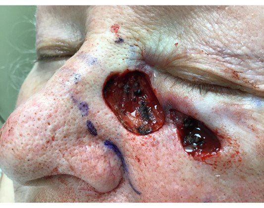 A 72 year-old female patient was referred to our office for treatment of a basosquamous carcinoma of the left side of her nose (Figure 1). According to the patient, the lesion had been growing for several months and had bled. This type of skin cancer is somewhat of a mix of basal cell carcinoma and squamous cell carcinoma and is typically more aggressive than a standard basal cell carcinoma. Basosquamous carcinomas commonly behave in a manner similar to that of squamous cell carcinomas and can be very aggressive and even metastasize in some cases. Of note is a smaller secondary lesion a short distance away on the cheek of the patient. A biopsy of this lesion on the day of the surgery revealed a nodular basal cell carcinoma. (Figure 1.)