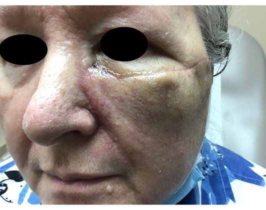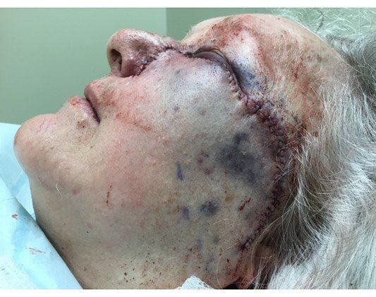 Several closure options were reviewed with the patient. Grafting was discussed, but she and her husband had significant concerns regarding the look of a graft, especially at this location. Ultimately, the patient opted for a rotation flap originating from her left cheek (Mustarde Flap). As we have discussed in a previous blog post, this flap has the advantage of being performed in a single stage while yielding a cosmetically pleasing result. Tissue from the lateral aspect of the left cheek was elevated and moved (rotated) centrally (Figures 3 and 4). This allowed for complete closure of both wounds while keeping the nose level and even and prevented the eyelid from being pulled down. The patient did develop bruising from the procedure due to the use of Plavix and aspirin. These medications were not held for our procedure as it is safer for the patient. At Pine Belt Dermatology, we almost never hold blood thinners prior to procedures. (Figure 3., Figure 4.)