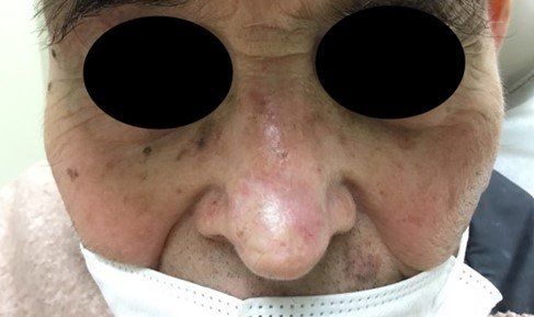 An 82 year-old male patient was referred to our office for evaluation of a biopsy proven infiltrative basal cell carcinoma of the nose (Figure 1). The patient stated that the spot had been preset for several months and that it had been enlarging.