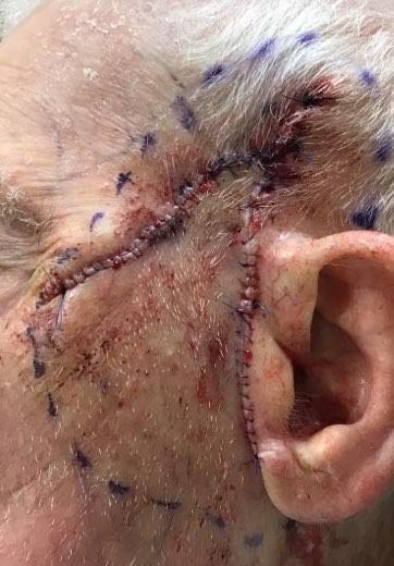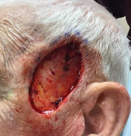 Due to the aggressive nature of the lesion, Mohs surgery was performed. After 3 stages of surgery the final defect can be seen below (Figure 2).