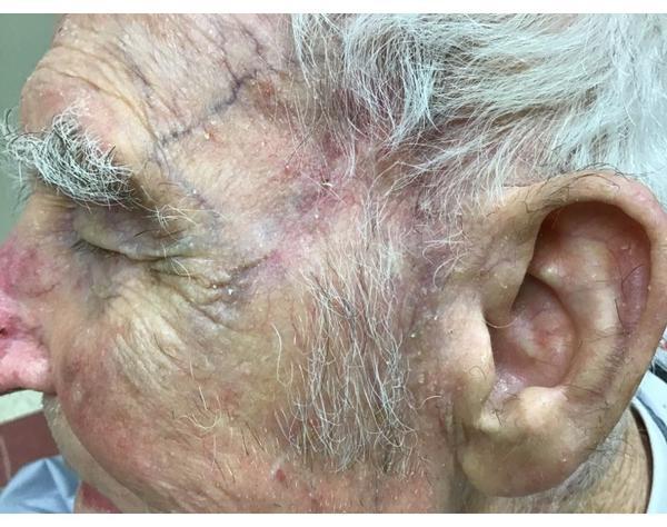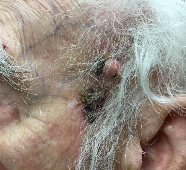 An 89-year-old male patient, presented to our office for the evaluation of a rapidly growing lesion on his left temple area. A squamous cell carcinoma had been removed from the same area one month prior. A biopsy of the lesion demonstrated a very aggressive moderately to poorly differentiated squamous cell carcinoma (Figure 1). This type of skin cancer can grow rapidly and has potential for metastasis.