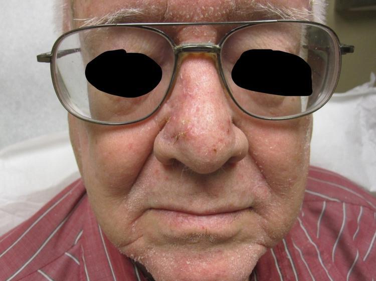 A 72 year-old male patient, presented to our office for the evaluation of a non-healing lesion on his nose. The patient stated that the lesion had been present for approximately 8 months. He thought that it was just a pimple that would not go away. If there is a lesion on the skin that does not go away within a few days, it is important to always get it looked at. That is what this patient did. A biopsy of the lesion demonstrated a micronodular basal cell carcinoma. Mohs surgery was performed. After 2 stages of surgery the final defect can be seen below